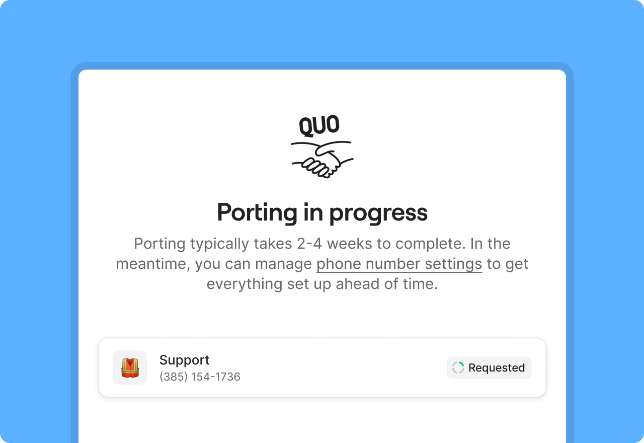 The process takes anywhere between 2 and 4 weeks and depends on how fast we hear back from your current phone service provider. Unfortunately, these timelines are out of our control and can't be sped up.