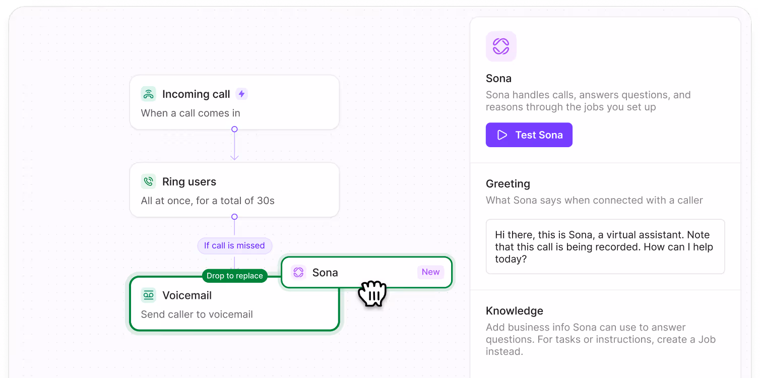 Sona, your AI receptionist, answers calls, qualifies leads, and routes conversations to the right person. It's always on, so your business never misses a customer.