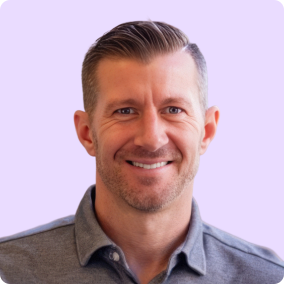 Smiling man wearing a gray zip-up sweater and white shirt against a light purple background.