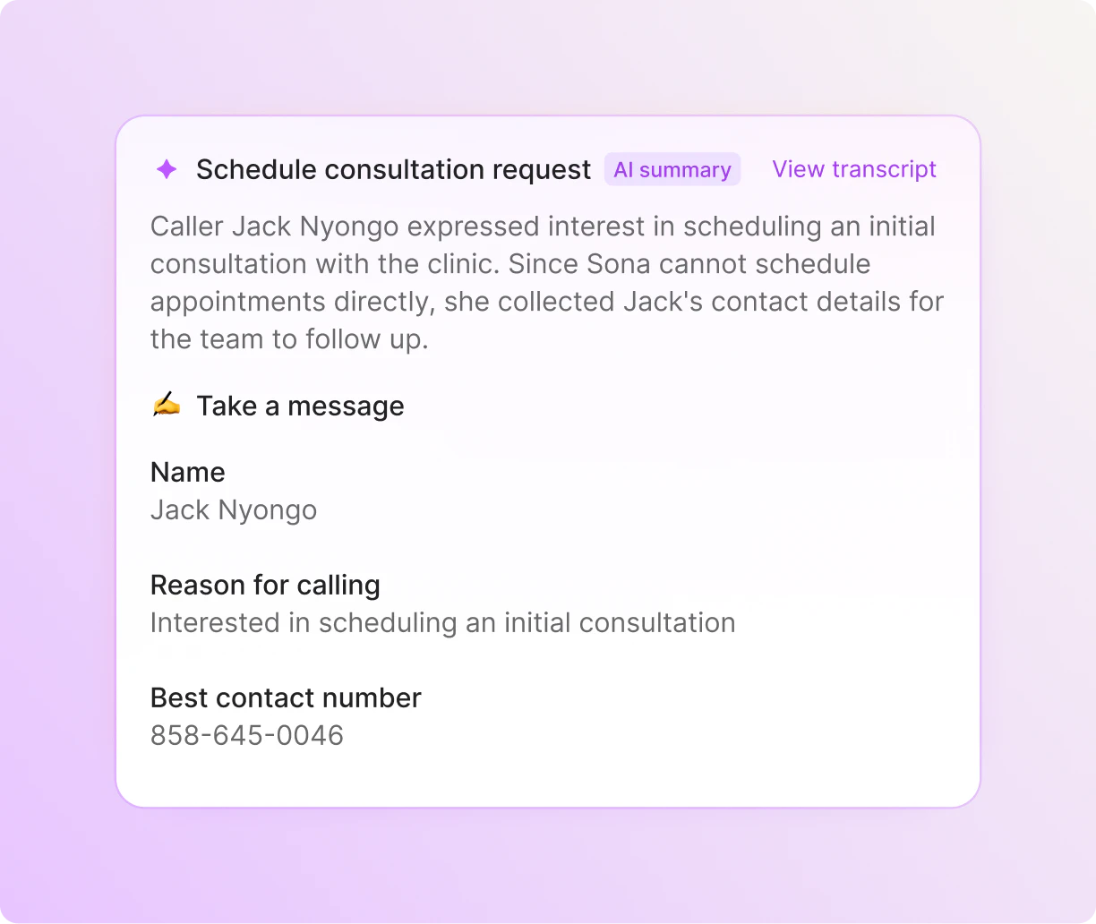Sona greets callers, answers questions, and captures messages all within the same phone system you use to communicate with patients.