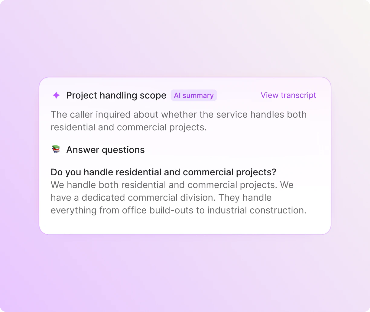 Traditional answering services create information silos that slow down your operations. Since their conversations happen outside your business phone, your team can waste valuable time piecing together customer and vendor updates, potentially missing urgent requests or details about project specifications.