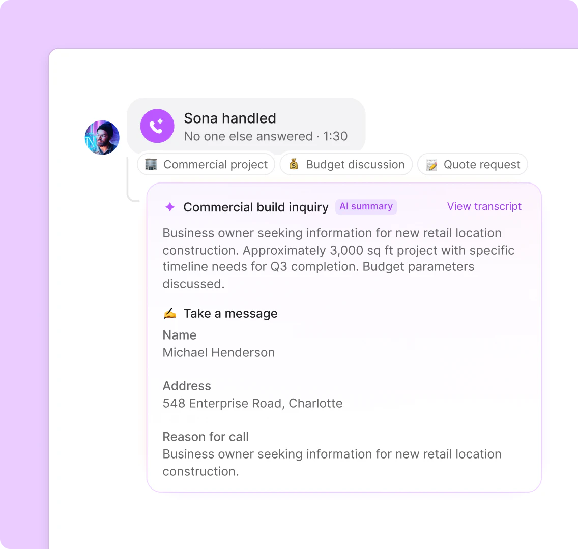 Any business can use Sona to handle incoming calls, answer customer questions, and take down messages. What makes Sona unique is that it can be customized to every business’s needs. Whether you’re a specialty contractor or a general contractor in the construction industry, you can use Sona as your in-house AI answering service.