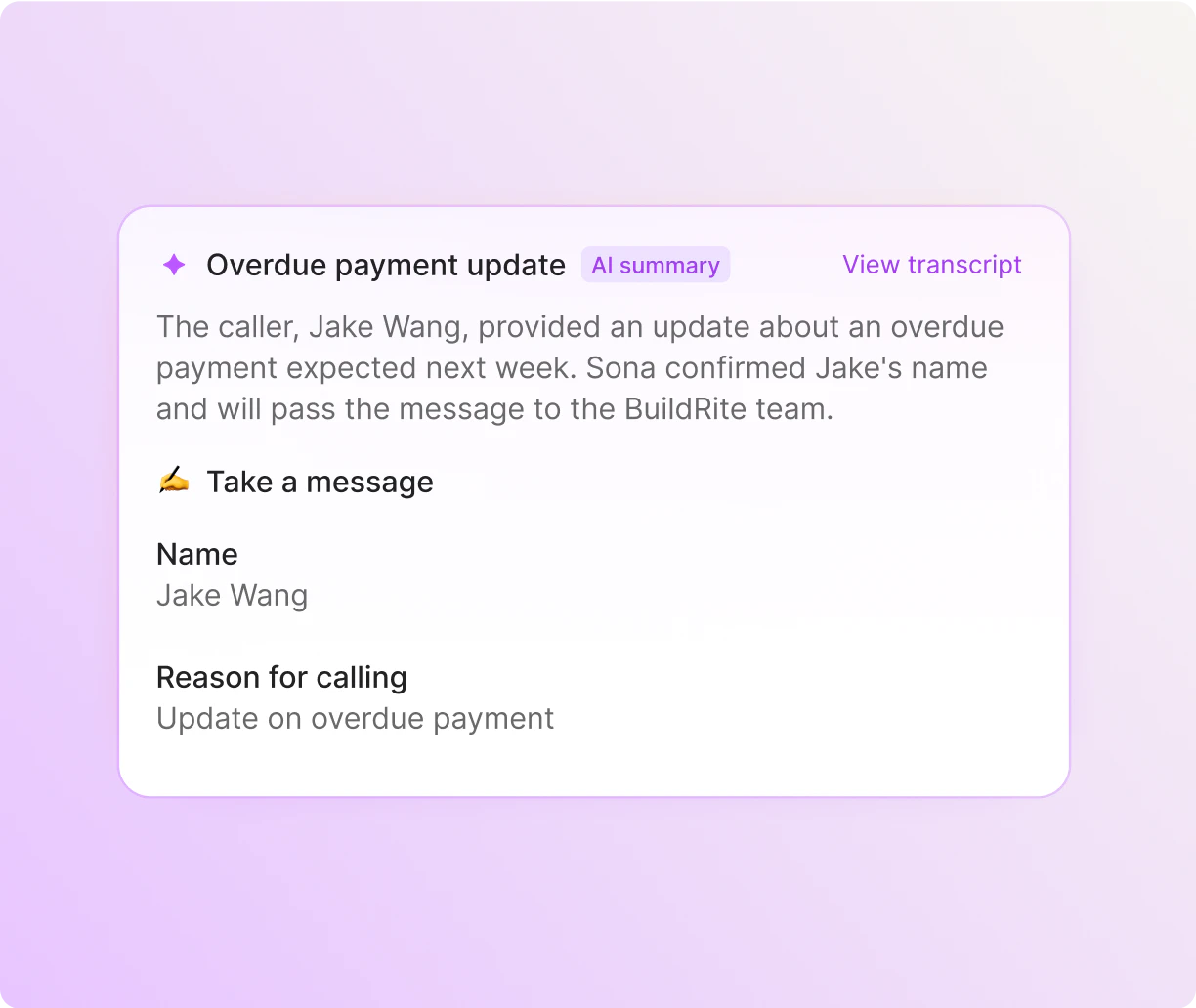 Sona greets callers, answers questions, and captures detailed messages according to your business needs. Customize every aspect of Sona to deliver the best customer experience.