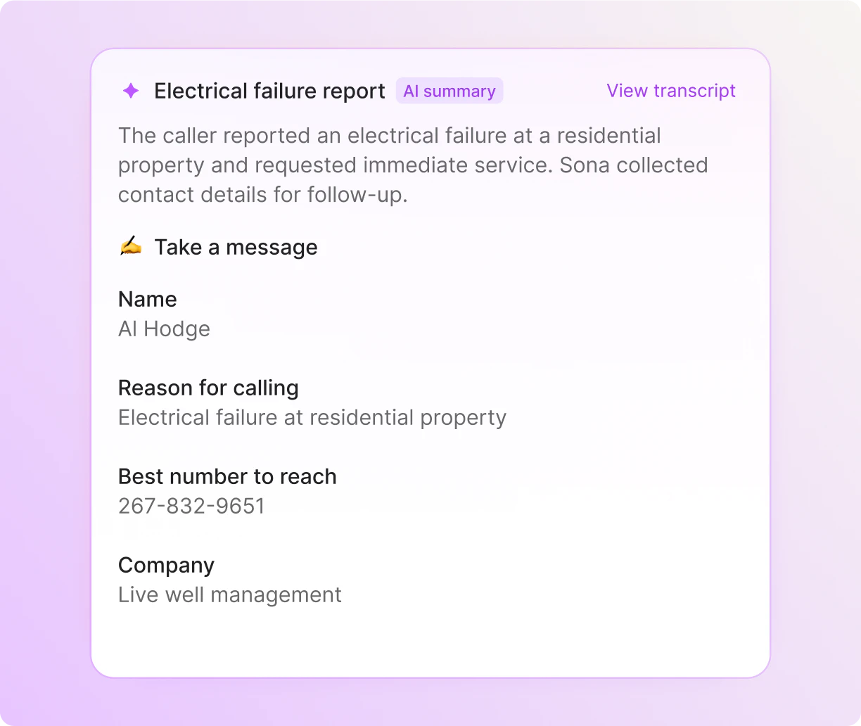Answering services specialize in core call management — capturing messages, answering basic service questions, and directing urgent electrical issues appropriately. They're perfect for electrical contractors who receive moderate call volumes but need professional coverage during jobs, after hours, or when dealing with emergency spikes. Solutions like Sona are designed for trade businesses that require reliable call handling without enterprise-level complexity.