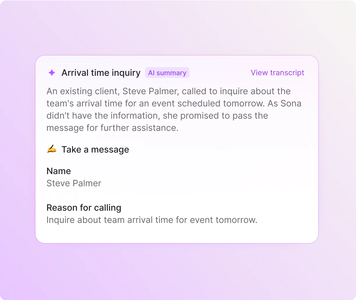 Sona greets callers, takes detailed messages, and answers questions — all customized to your business needs.