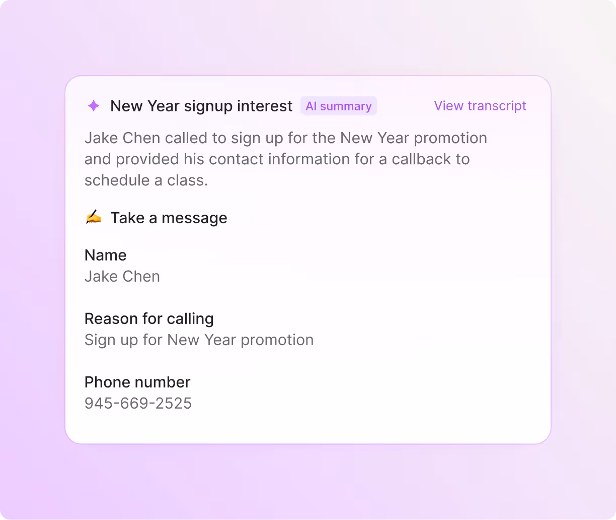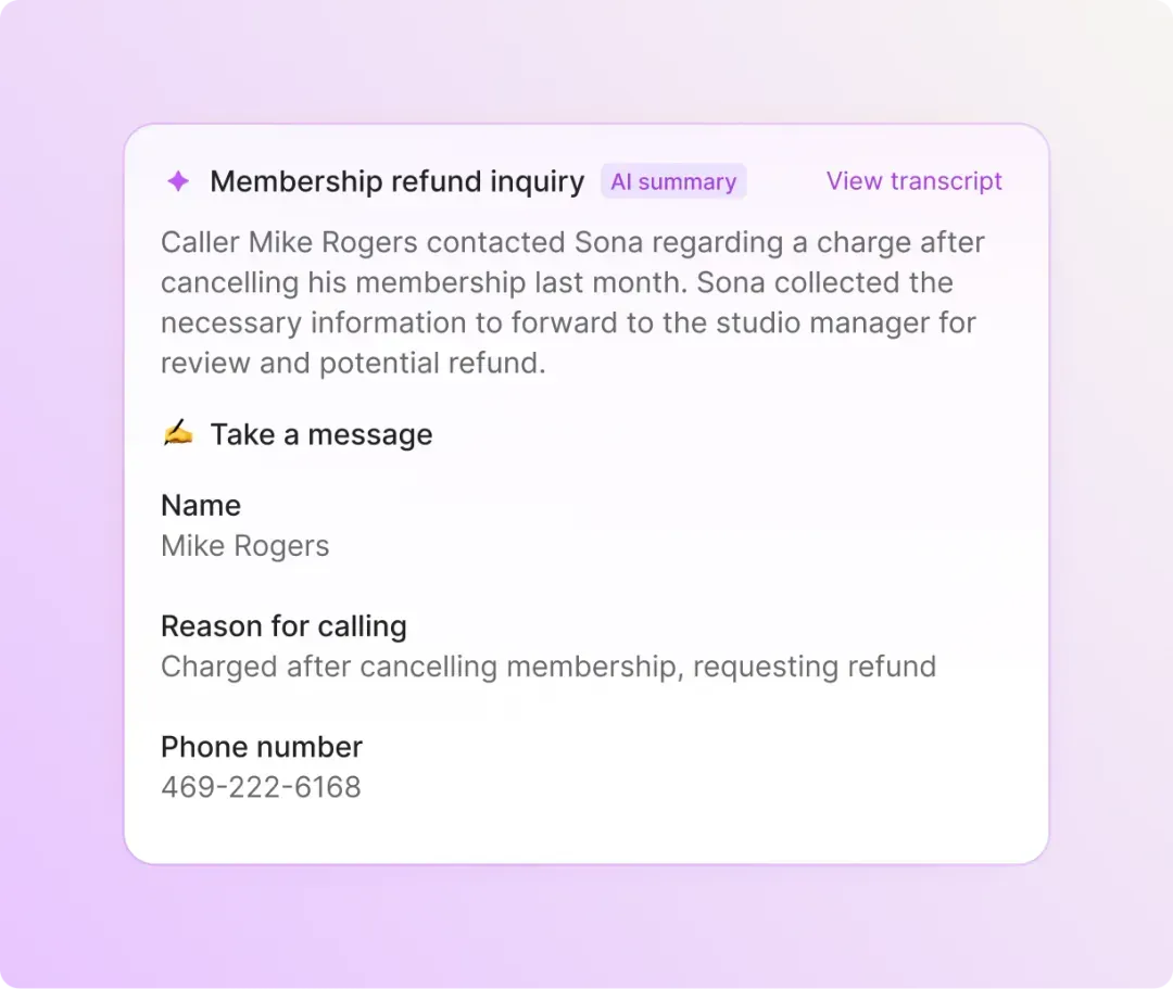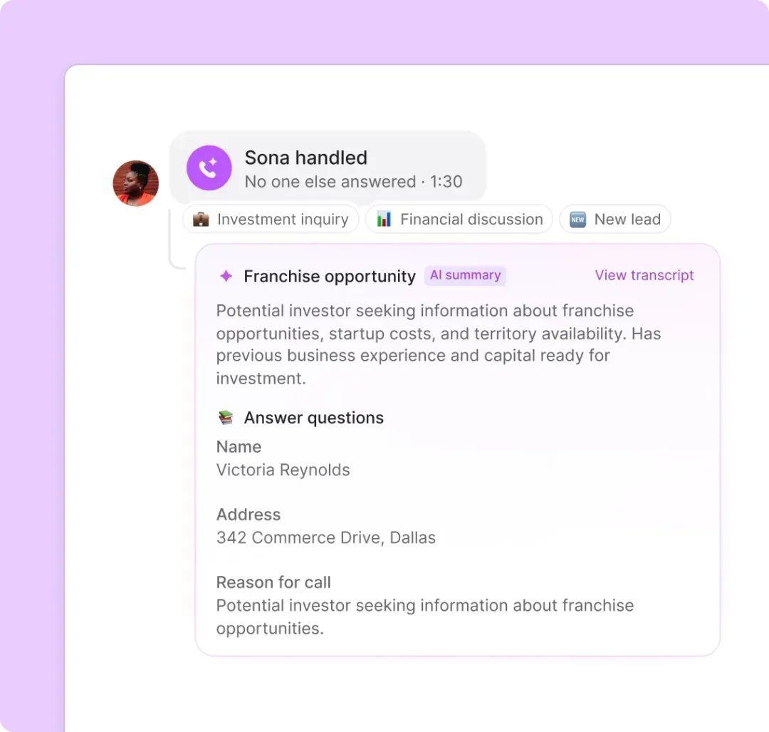 With all these features, franchise businesses can use Sona as an AI voice agent to improve customer satisfaction over the phone. Callers get a better experience compared to leaving a voicemail, and teams have more context before they call back.