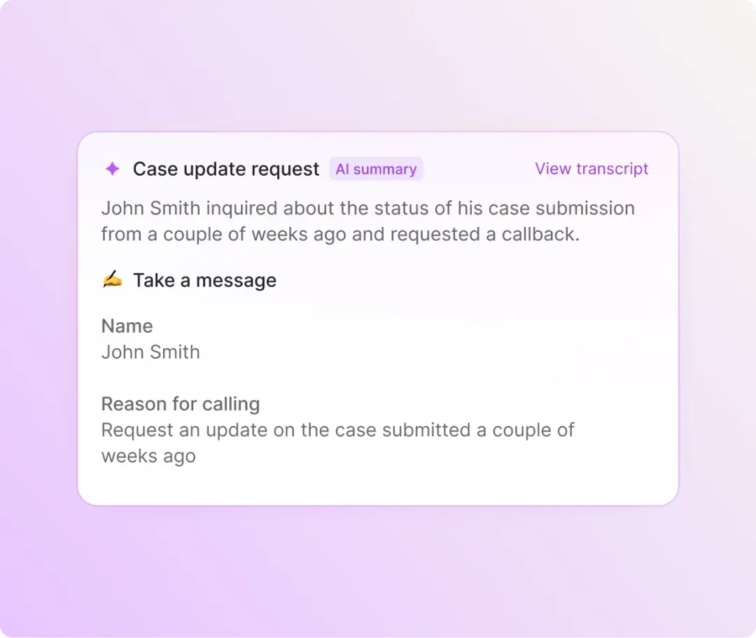 Make your intake process smoother with Sona. Give instructions to Sona to ask follow-up questions based on specific keywords in a conversation. For example, if a caller is not an existing client and wants to schedule a consultation, Sona can ask about the specifics of their case to pass along to your team.