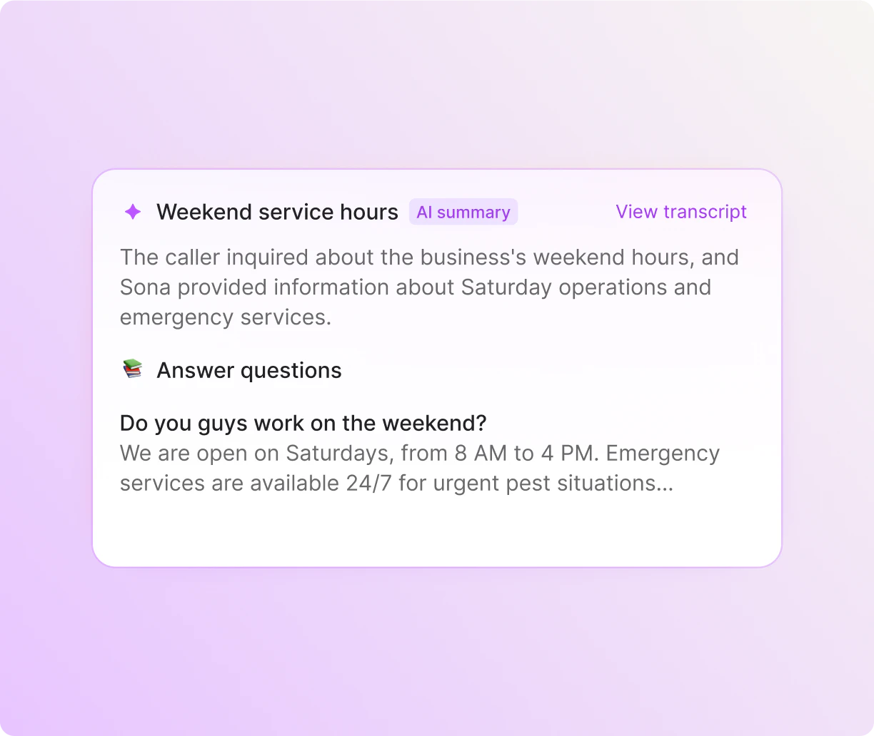 Sona can ask follow-up questions based on specific keywords when it takes a message. For example, if a customer is interested in scheduling an exterminator visit, Sona can ask for their preferred dates and times and make a note of it.