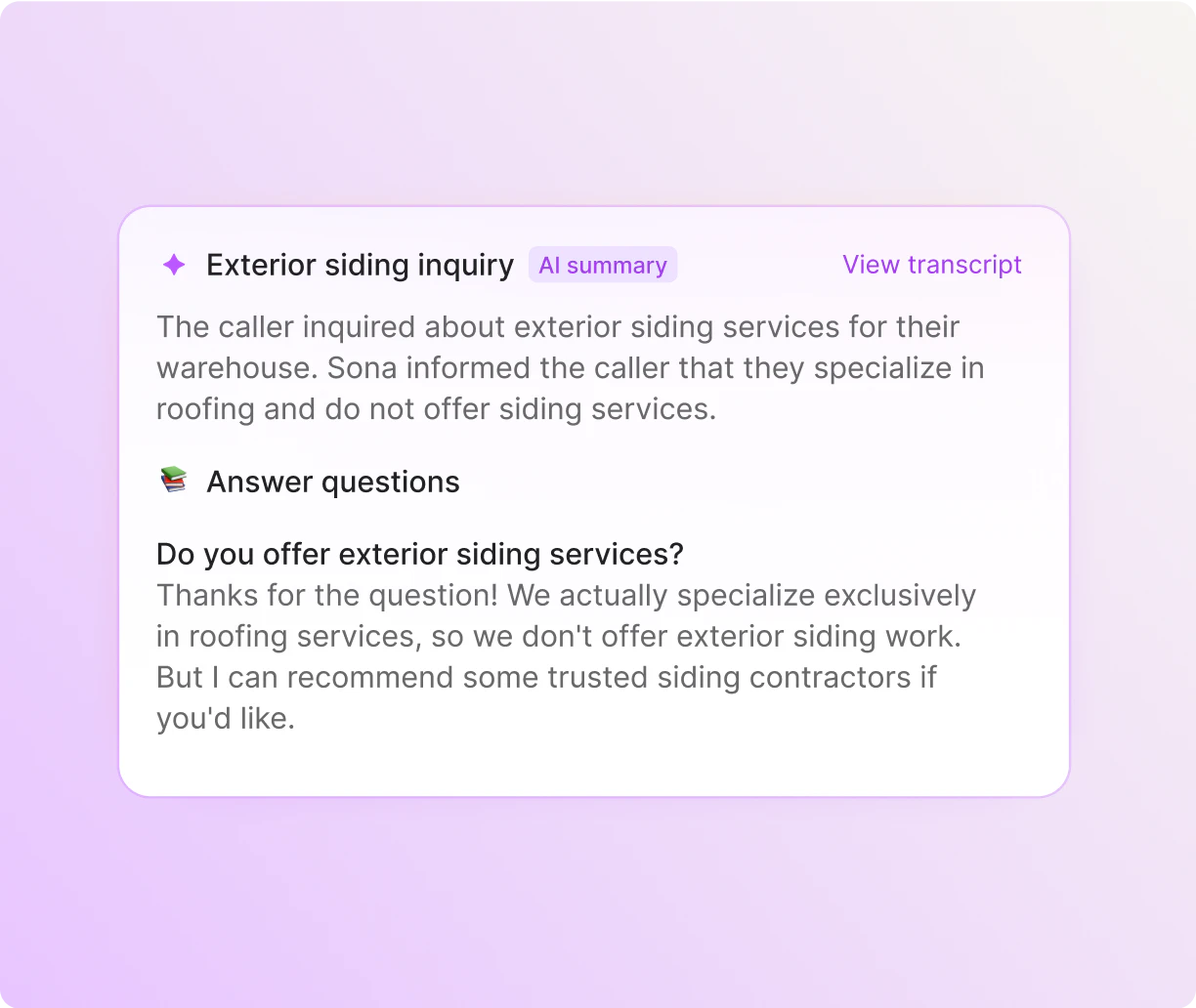 In our admittedly biased opinion, Sona is the best roofing answering service. Unlike live call answering services, Sona can be customized to your business needs in minutes. Since it works within Quo, your team can instantly review call summaries and transcripts and immediately follow up with existing and potential customers.