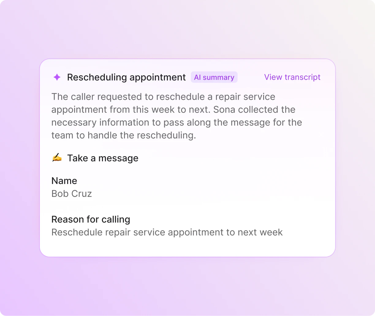 Sona is Quo's AI answering service and is seamlessly integrated in our platform. Sona call recordings, summaries, and transcripts appear in your Quo inbox just like any other call. Your team can get up to speed on Sona’s calls. Then, assign follow-up action items based on customer requests and project updates.