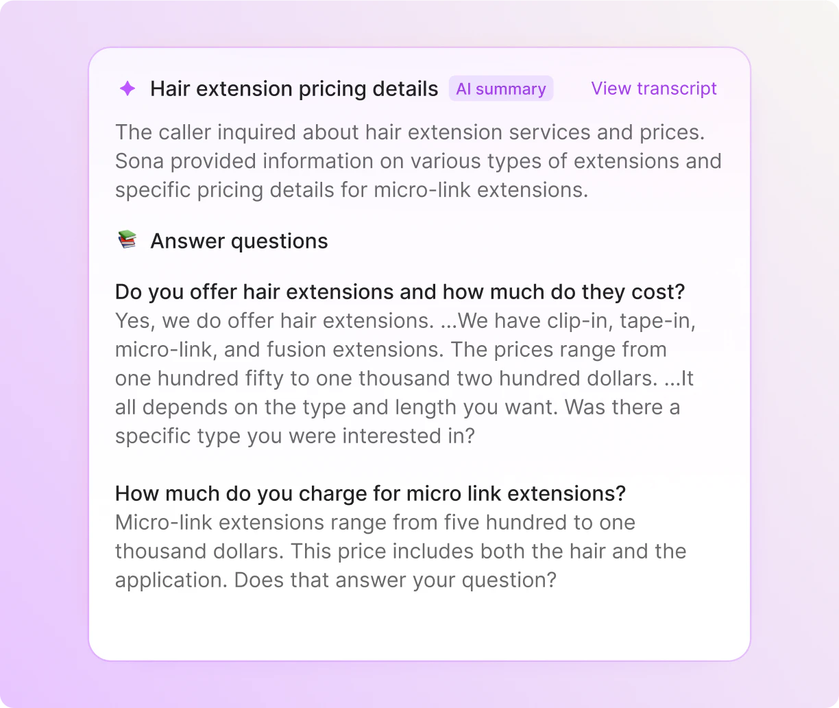 Quo is a modern business phone system that helps salons manage calls, texts, and client communications in one place. Sona works seamlessly within Quo — Sona’s calls, summaries, and transcriptions also all live in your Quo workspace.