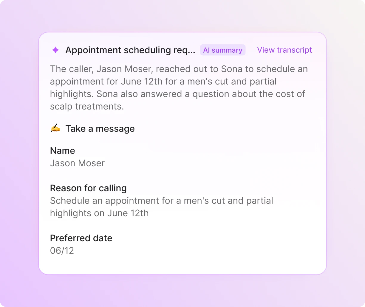 Sona can ask follow-up questions based on specific keywords when it takes a message. For example, if a customer is interested in scheduling an appointment, Sona can ask them if they have a stylist preference and make a note of it.