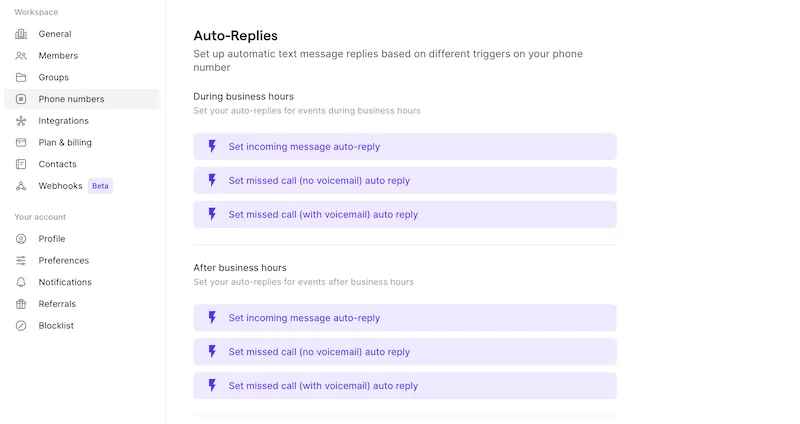 La función de respuestas automáticas de OpenPhone solo envía un mensaje a un número cada tres horas. Si tu cliente envía mensajes de texto o llama varias veces, Quo no los bombardea con mensajes de texto, lo cual garantiza que los mensajes no molestarán a tus clientes.