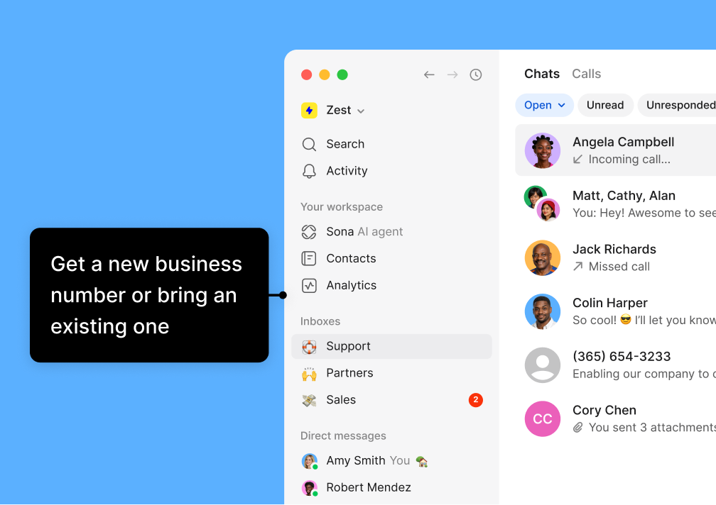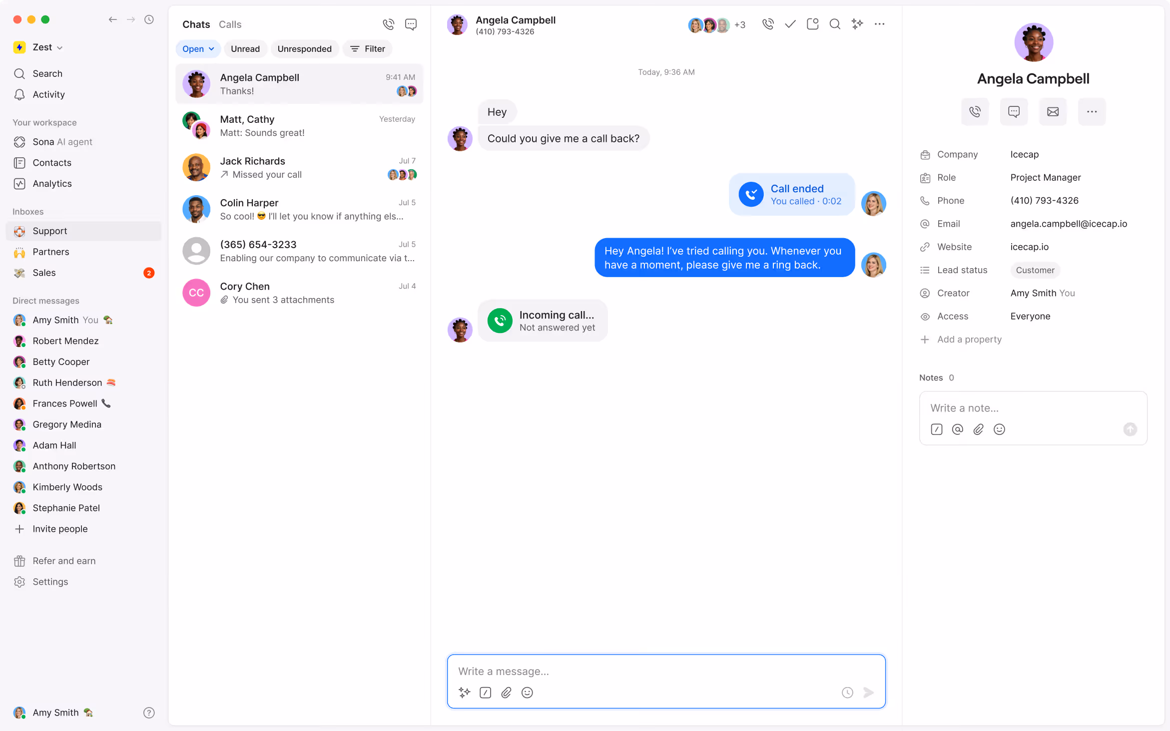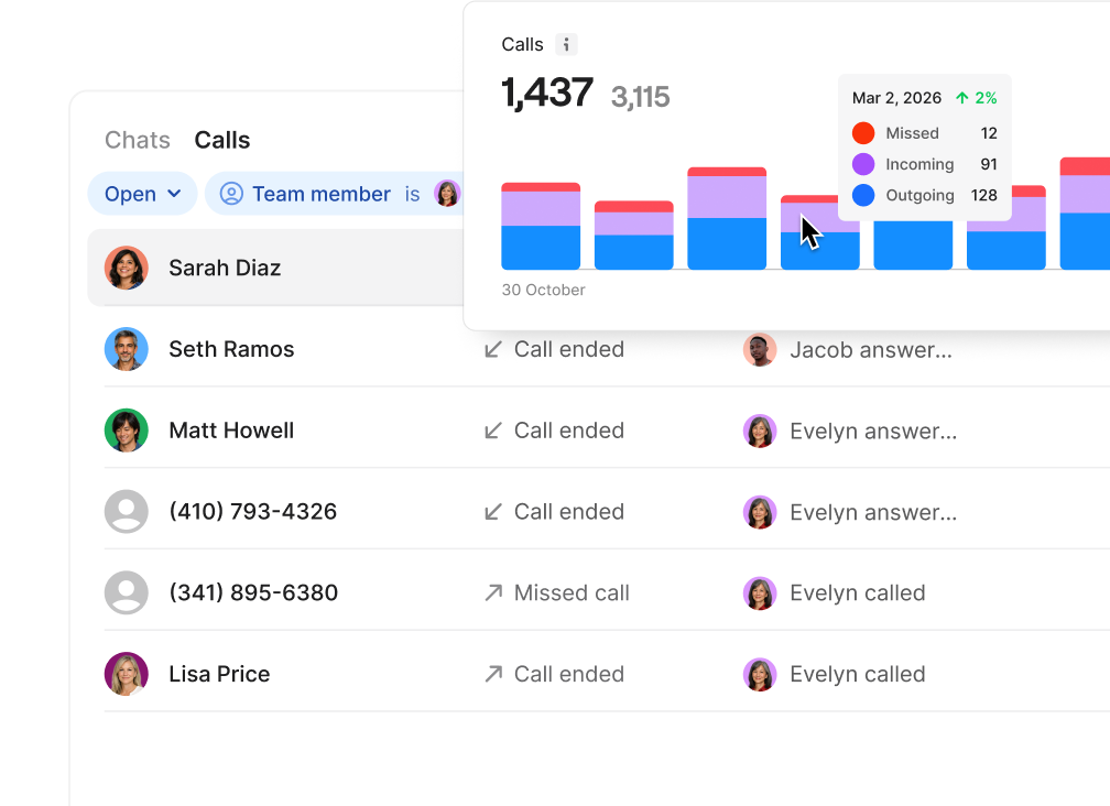Reply instantly with saved responses, get up to speed fast with call summaries, and collaborate behind the scenes — so you never lose momentum with a customer.