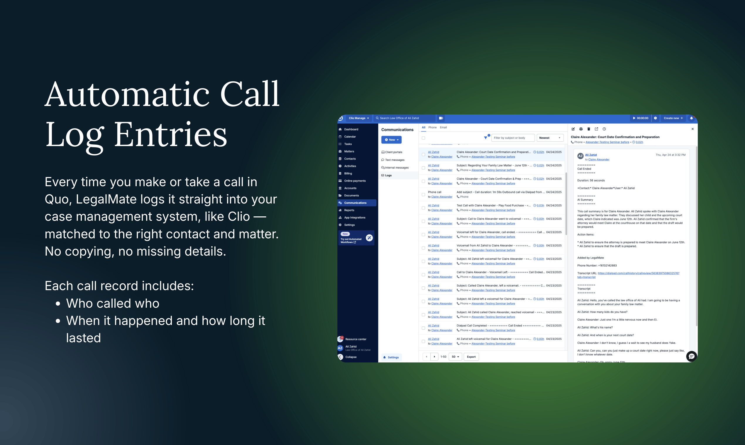 Automatically sync Quo calls into your Clio legal CRM so every client conversation is logged, matched to the right matter, transcribed, and summarized without manual work. With LegalMate connected, incoming and outgoing calls from your Quo numbers become searchable records in Clio, intelligently associated with the correct contact and file, with AI-generated summaries, structured matter notes, and billable time entries — helping firms keep complete histories, reduce admin, and accelerate billing.