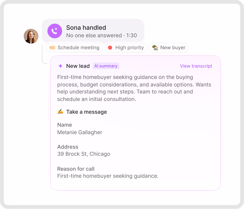 Sona is an AI agent that answers calls 24/7 so you never lose an opportunity — even when you're busy or after hours.
