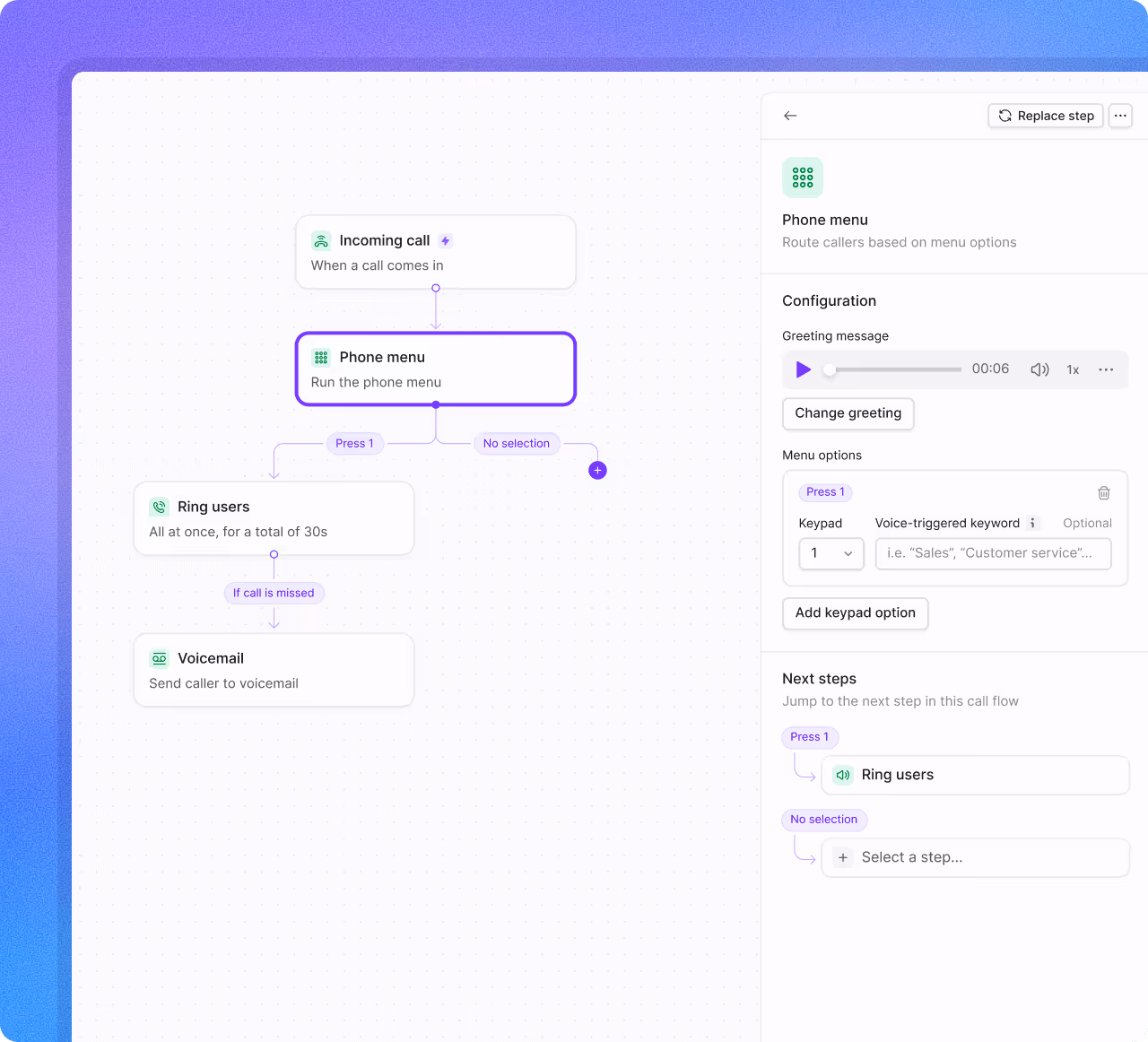 Design your call routing visually with drag-and-drop simplicity - see exactly how calls will flow, easily set up after-hours menus, route VIP customers to specific team members, and make changes without technical headaches or disrupting customer experience.