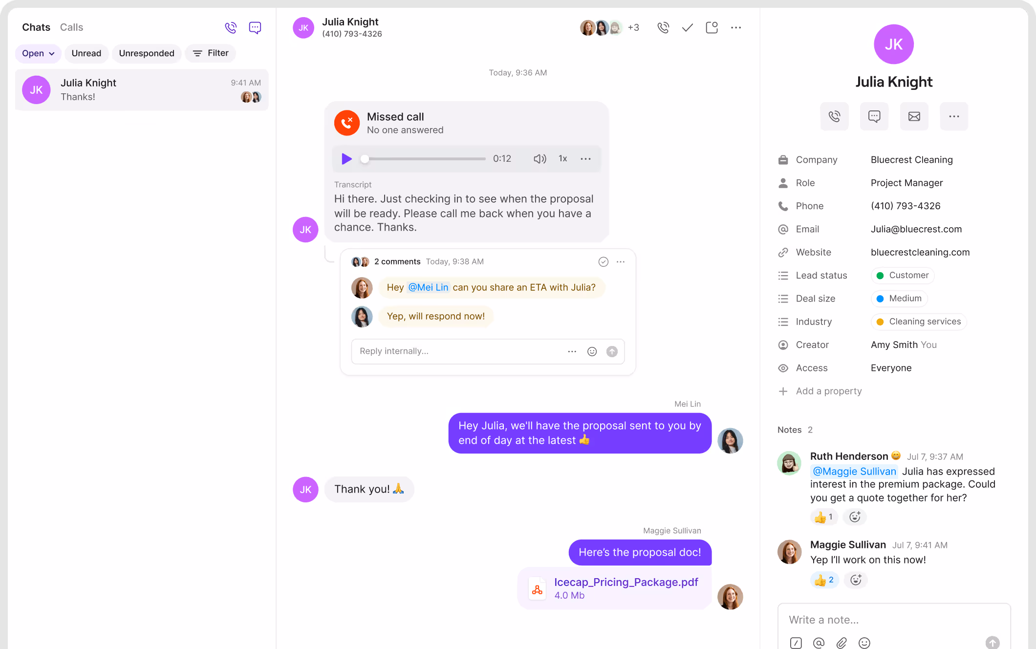 See every detail tied to a contact alongside the conversation, so you always understand where things stand before reaching out.