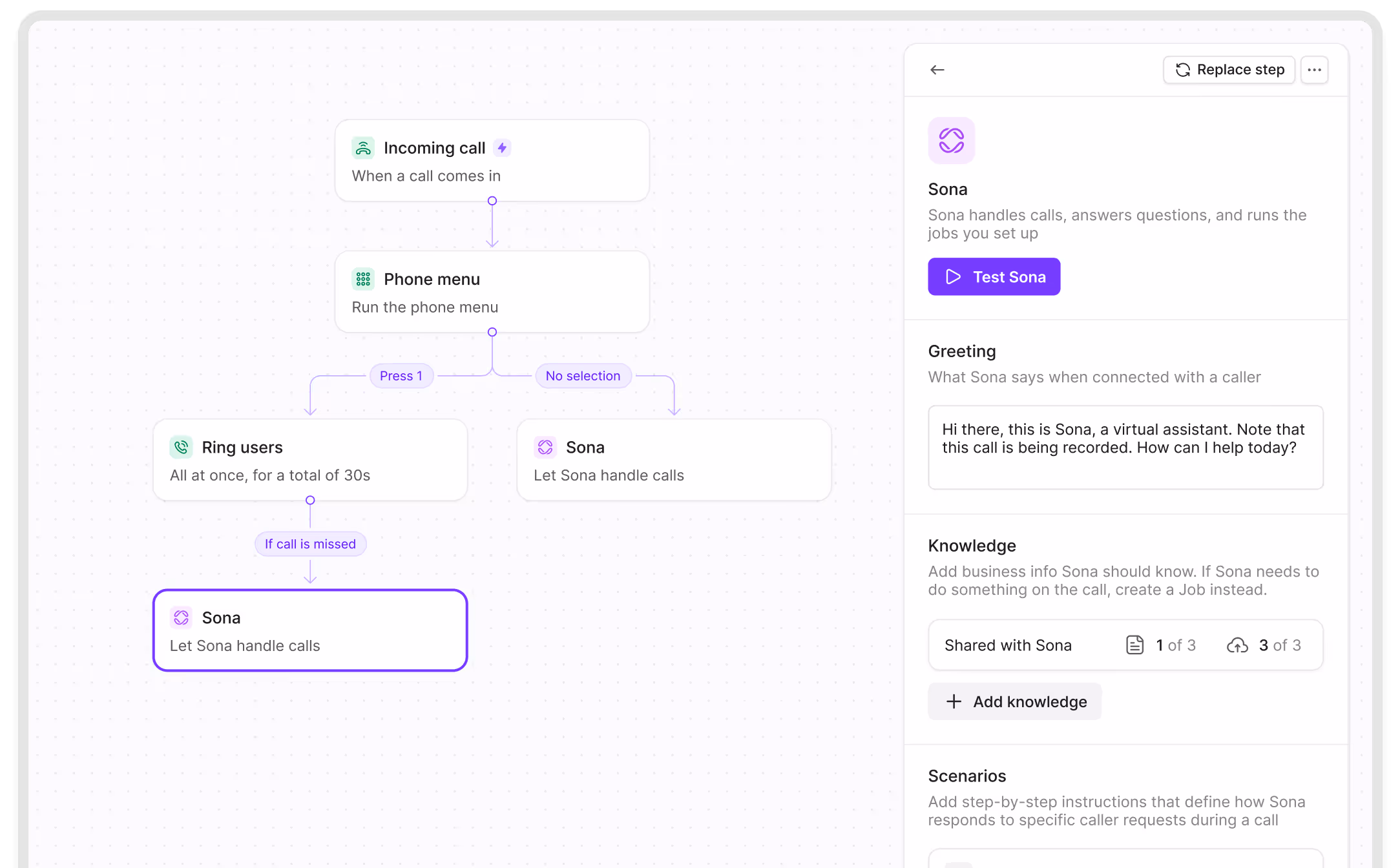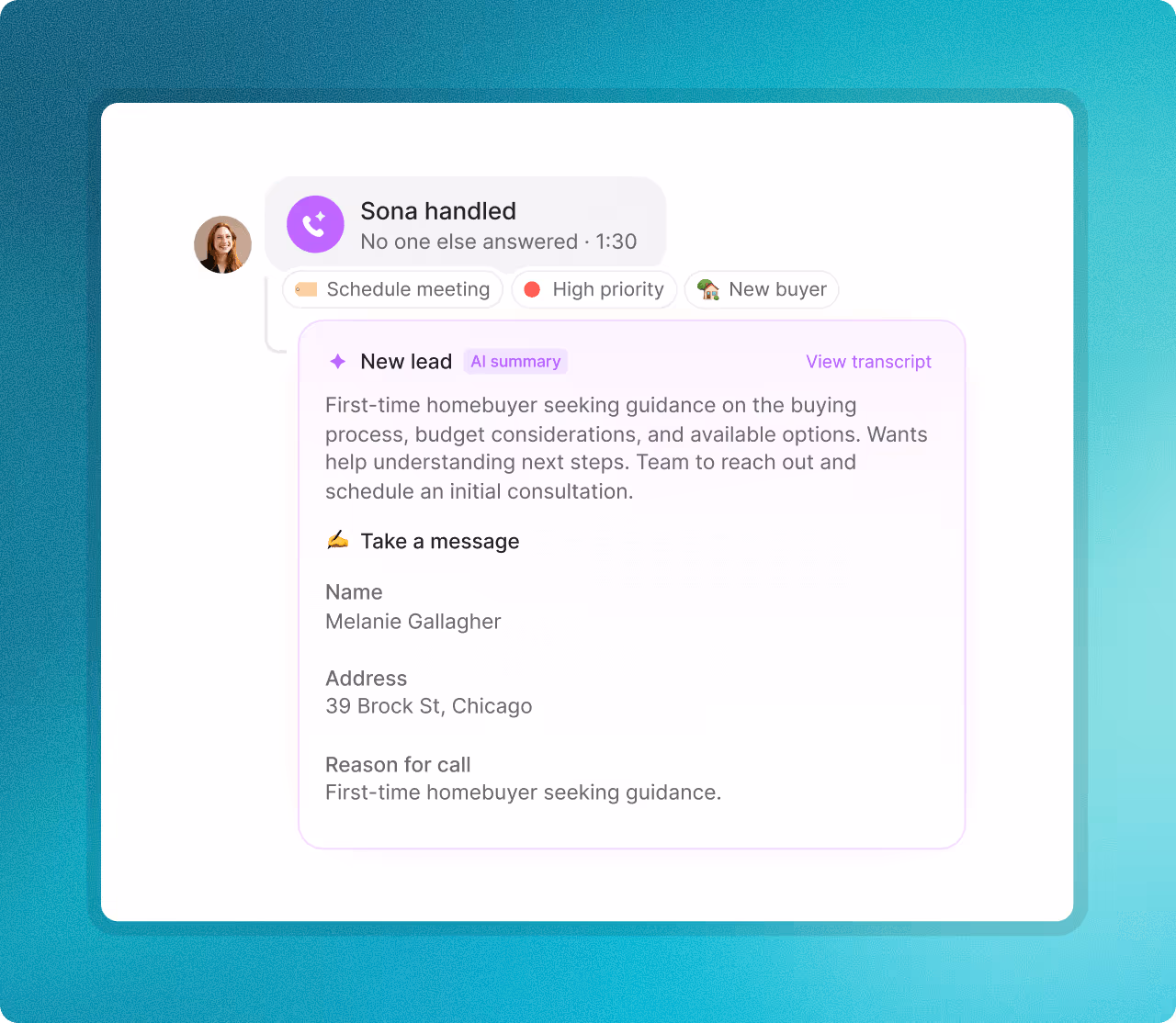 Let callers talk to Sona — your AI agent — instead of voicemail. They get instant help, and you follow up faster with organized, actionable messages.