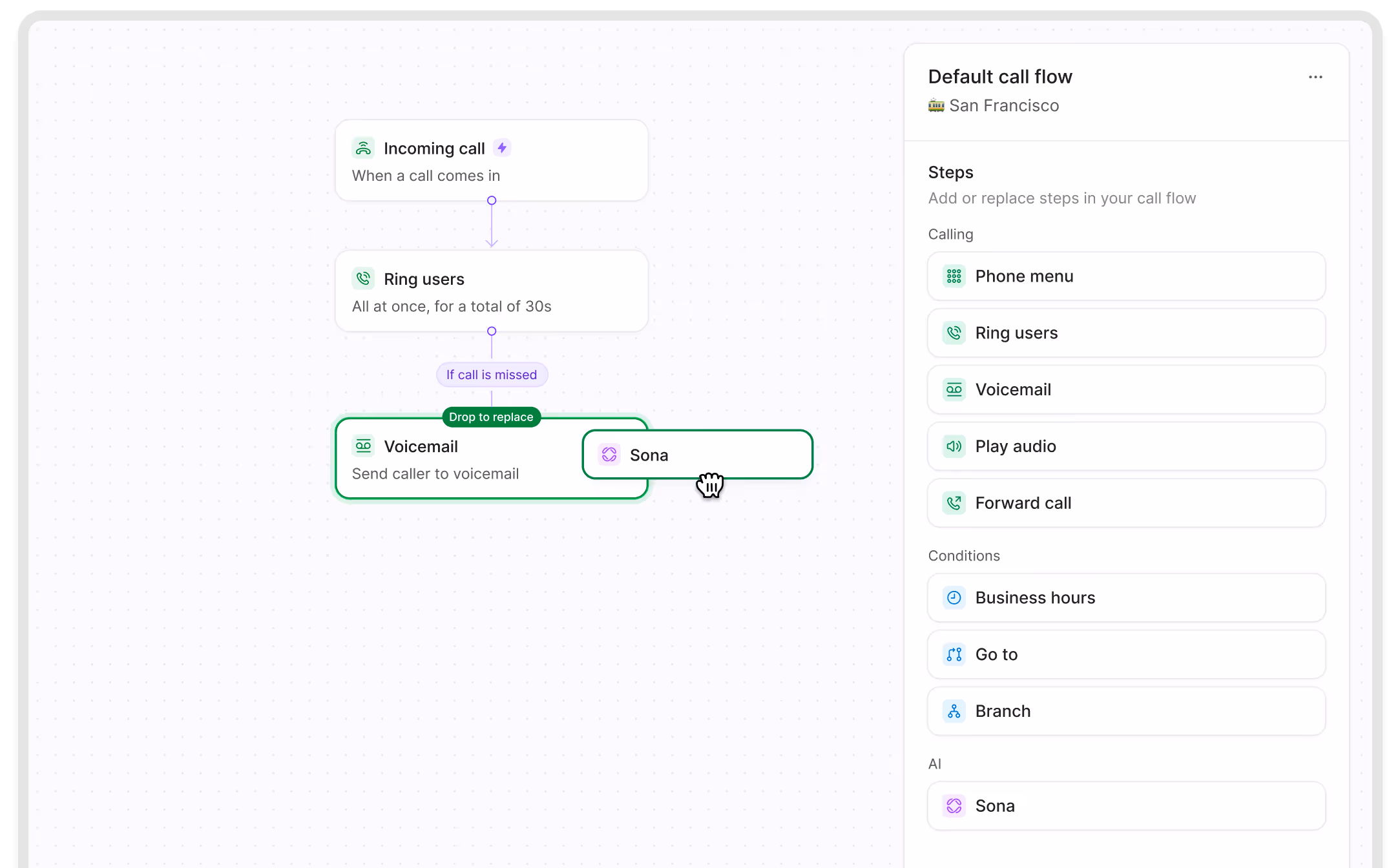 Design your call routing visually with drag-and-drop simplicity - see exactly how calls will flow, easily set up after-hours menus, route VIP customers to specific team members, and make changes without technical headaches or disrupting customer experience.