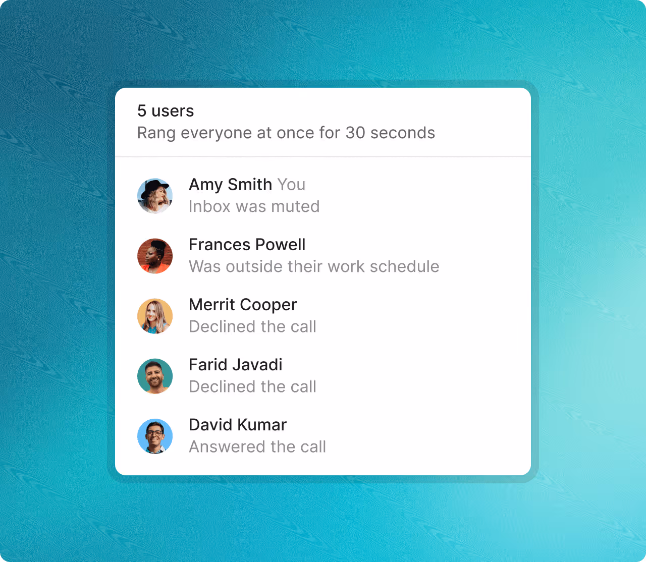 Availability-based routing sends calls to whoever's actually working, so customers get answers even when the usual contact is on vacation.